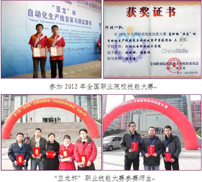 2009年、2010年、2011年参加“亚龙杯”全国高职院校“自动生产线安装与调试”技能大赛,取得优异成绩。2012年6月参加全国职业院校技能大赛高职组自动化生产线安装与调试赛项中荣获三等奖。