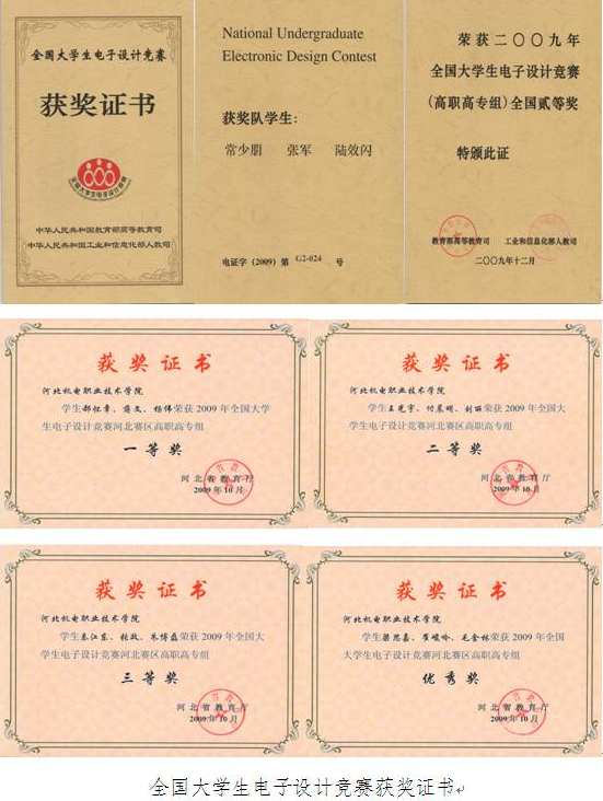 在“全国大学生电子设计竞赛”中获得非常优异的成绩(全国二等奖1项、河北赛区一等奖2项、河北赛区二等奖3项、河北赛区三等奖3项、河北赛区优秀奖5项)。由教育部主办的2011年全国信息技术水平应用大赛中首届“单片机应用与开发”中,取得多项奖项,获得优异成绩。