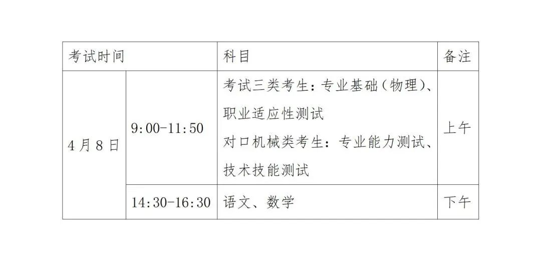 职业技能考试总分450分,包括专业能力测试和技术技能测试两科,采取合卷考试形式,考试时间共170分钟。其中专业能力测试满分100分,考试时间为50分钟;技术技能测试满分为350分,考试时间为120分钟。报考对口机械类的考生均须参加职业技能考试。
