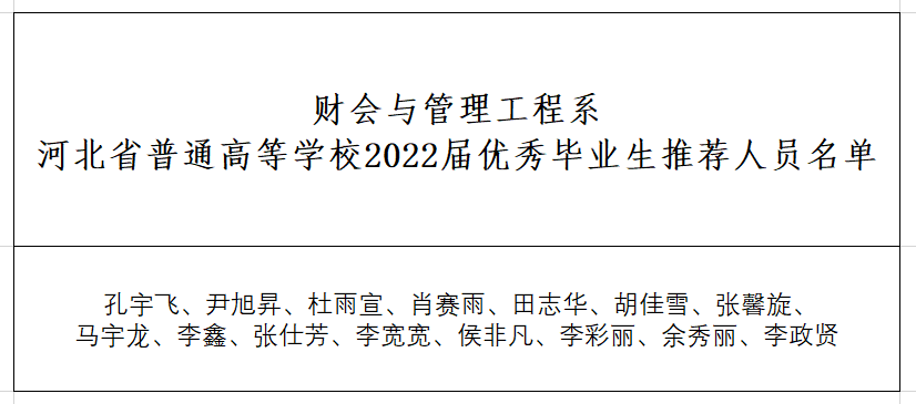 依照欧宝平台app苹果版 关于评选河北省普通高等学校2022届优秀毕业生的通知,经财管系优秀毕业生评审领导小组审定并经系党政联席会讨论通过,现将拟推荐参评名单予以公示,公示时间2022年4月4日至4月6日,如有异议,请向财会与管理工程系反映。推荐名单如下: