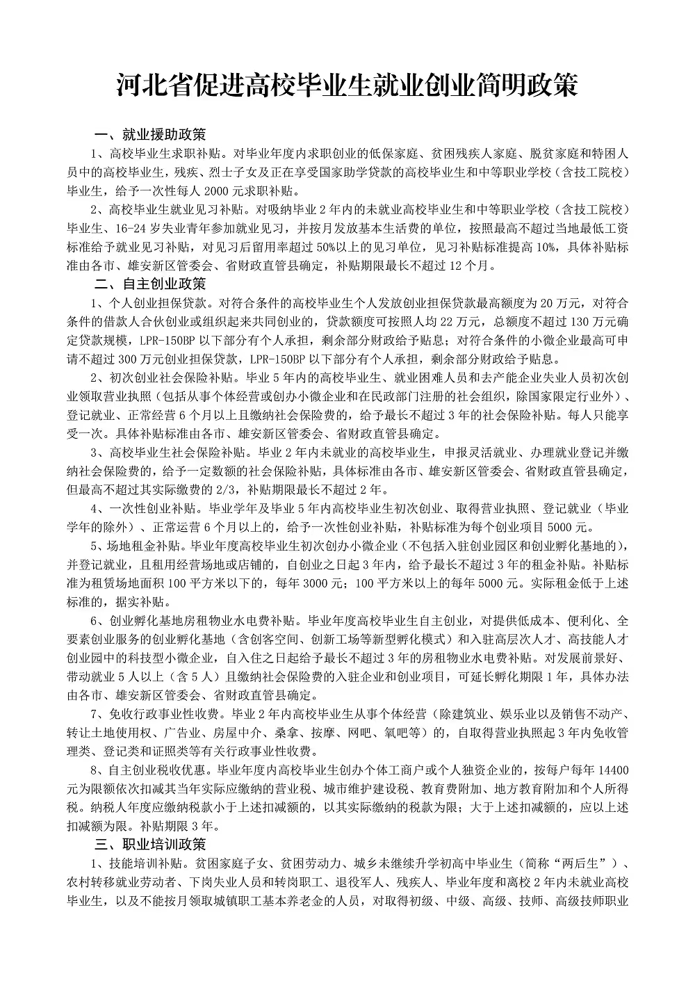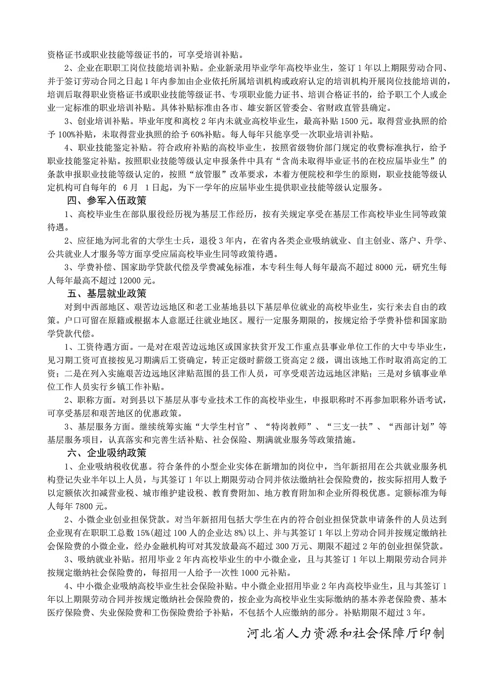 河北省促进高校毕业生就业创业简明政策