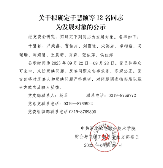 公示时间为2023年09月22日一09 月28日。党员和群众可来电、来访反映问题。反映问题应实事求是、客观公正。党支部将对反映人和反映问题严格保密,对问题调查核实后以适当方式向反映人反馈。