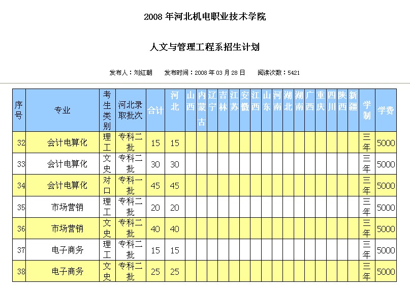 2008年人文与管理工程系招生计划