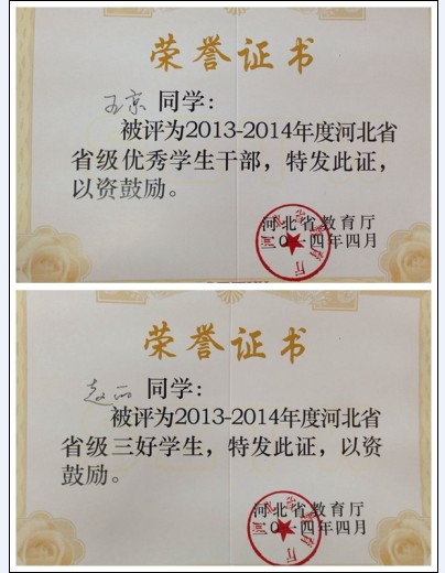 2013--2014年度省级优秀学生干部获奖证书(会计1203班王京)