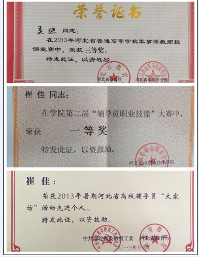 学生管理工作的关键是学生管理队伍,近年来,系党总支以学管队伍建设为抓手,认真做好学管工作,特别注意加强辅导员队伍和系学生会、团总支学生干部两支队伍的教育、管理和监督,要求他们以身作则,无私奉献,树立全心全意为学生服务理念,踏实工作,实事求是,发挥好组织领导、桥梁纽带和助手作用,要具有强烈的集体荣誉感和良好的团对协作精神和创新精神,一切以大局为重,心想集体,心系集体。经过几年的建设,效果初显,在大家的共同努力下,我系集体和个人先后获得过“河北省优秀班集体”、“市优秀团支部”、“省优秀学生干部”、“市优秀团务工作者”、“市优秀共产党员”,我系连续多次荣获院运动会“精神文明奖”等荣誉。与此同时,辅导员队伍也取得了优异的成绩,尽管他们都是年轻的80后,但经过几年的努力工作,管理水平有了大幅度的提高,取得了众多荣誉。崔佳获“省级先进德育工作者”、“2013年度暑期大家访”活动先进个人,吴迪获省军事理论课授课大赛三等奖,崔佳代表欧宝平台app苹果版 参加“河北省第一届辅导员职业技能大赛”获二等奖,崔佳、杨星代表欧宝平台app苹果版 参加“河北省第二届辅导员职业技能大赛”获二等奖,崔佳、杨星分获欧宝平台app苹果版 “第二届辅导员职业技能大赛”一、三等奖。