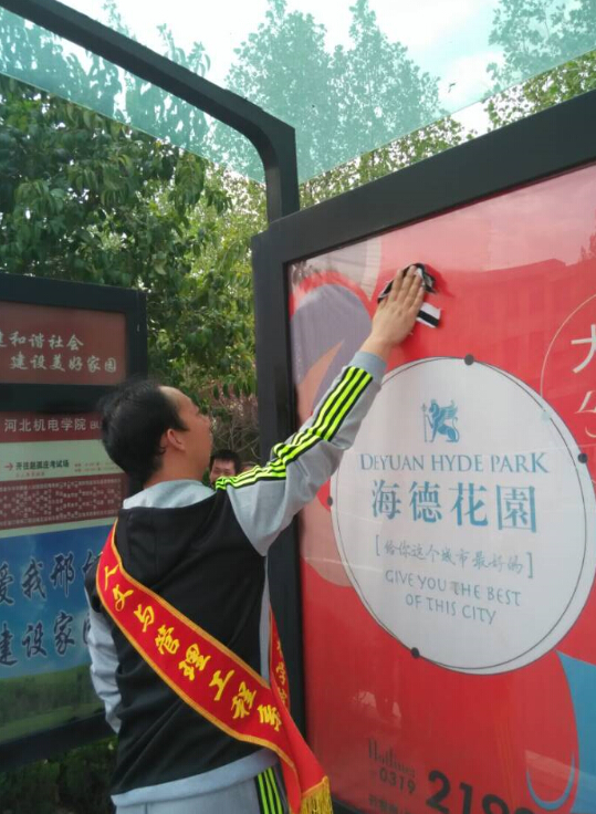 了原有的容貌。清除过后,志愿者们不忘清扫散落在地面上因清除而掉落的纸屑等杂物,很好地完成了善后工作。