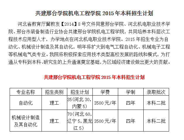 共建邢台欧宝平台app苹果版 欧宝官方体育app下载ios 工程欧宝平台app苹果版 2015年本科招生计划