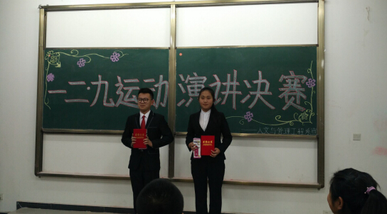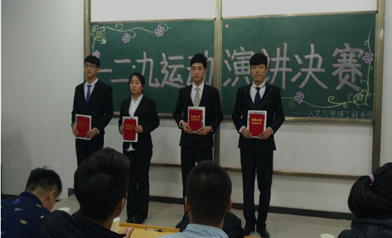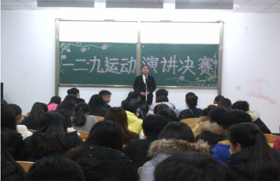 为了继承和发扬爱国主义精神,纪念“12·9”学生爱国运动,使学生树立为报效和振兴中华民族而努力学习的远大志向,也为了丰富学生的课余生活,提高学生的综合素质和综合能力。我系于2015年12月8日在B座103由团总支、学生会学习部组织举办了“纪念‘12·9’运动”演讲比赛。我系学生会主席杨宏伟,副主席董笑轻、李吻、李佳宁以及各部部长出席了此次活动并担任评委。