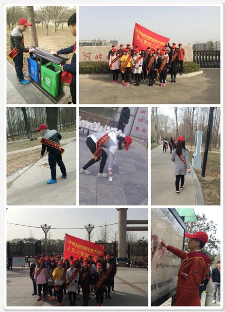 上午9点,同学们从学校门口出发,在辅导员老师的带领下,举着我系的旗帜,戴着志愿者专属的“小红帽”,身披我系绶带,井然有序的走在马路上,为这个春天增添了一抹青春的气息。在经过沿途的公交站牌的时候,志愿者们用随身携带的抹布、纸巾将站牌擦拭干净。到达目的地达活泉公园后,志愿者们发现虽然作为邢台市知名景点,但公园内有很多被游人随手扔掉的垃圾,与整个环境极不协调,极大地影响了人们休闲、娱乐的感受,于是全体志愿者立即着手开始清理活动。在整个劳动过程中,参加活动的老师们吃苦在前,给同学们做出了榜样,带动同学们发扬能吃苦,能战斗的精神,全身心地投入到了“净化环境,美化城市”的劳动中。他们有的捡石块,有的捡果皮纸屑,有的清除杂草,干的热火朝天。最后,大家在公园里合影留念,为此次志愿活动留下一个永久的纪念。更