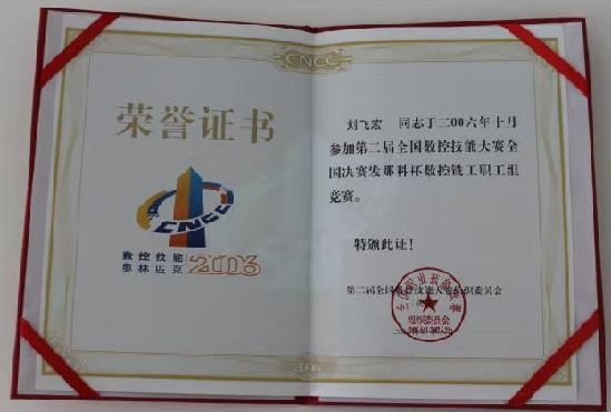 2004年,刘飞宏同学在全国数控技能大赛河北赛区学生组数控加工中心操作工决赛中,获全省第二名,王健同学获第三名;刘飞宏代表河北省参加第一届全国数控技能大赛全国决赛获加工中心操作工(学生组)第51名。毕业后刘飞宏就职于中国航天科技集团公司,坚持学习不断提高技术水平,多次代表单位参加各类技能大赛,获得了骄人的成绩,于2015年荣获中国航天基金奖。