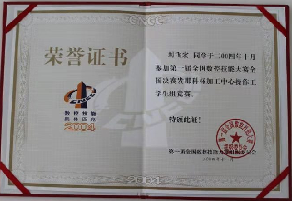 欧宝官方体育app下载ios 学生刘飞宏参加第一届全国数控技能大赛全国决赛发那科杯加工中心操作工学生组竞赛,取得第51名(2004年)