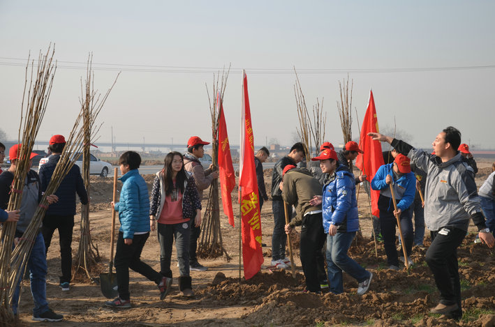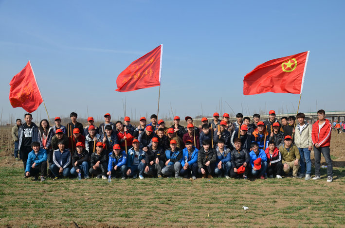 上午九点到达植树区域---邢台市开发区留村镇西南俎村,在欧宝平台app苹果版 团委书记籍宇的带领下,同学们拿着铁锹、铲子等工具,即分工又协作,搬运、挖坑,大家同心协力将树苗小心翼翼扶植在挖好的树坑内,之后培土、踩实,每个环节大家都一丝不苟,看着亲手种下的绿色树苗,同学们都满是欣喜,拿出鲜红的团旗,在新植的一排小树苗之前合影留念,红绿的色彩搭配为春天的邢台再添一抹靓色。