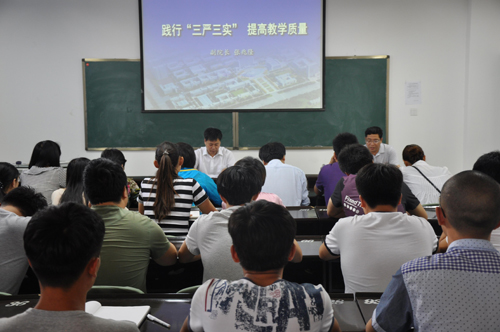 张院长从"三严三实"的丰富内涵和重大意义、深入查摆"不严不实"问题、践行"三严三实"要求、提高教学质量四个方面给老师和学生进行了讲解。张院长指出"三严三实"虽然只有短短6句话24个字,言简意赅,但是内涵丰富、精辟深刻,是我们做人做事、为官用权的警世箴言。张院长强调党员干部要把思想和行动统一到党中央和习总书记对从严治党的要求上来,自觉践行"三严三实",内化于心、外化于行,真正使自己的作风严起来、行动实起来,做对党忠诚、干净干事、敢于担当的好干部。