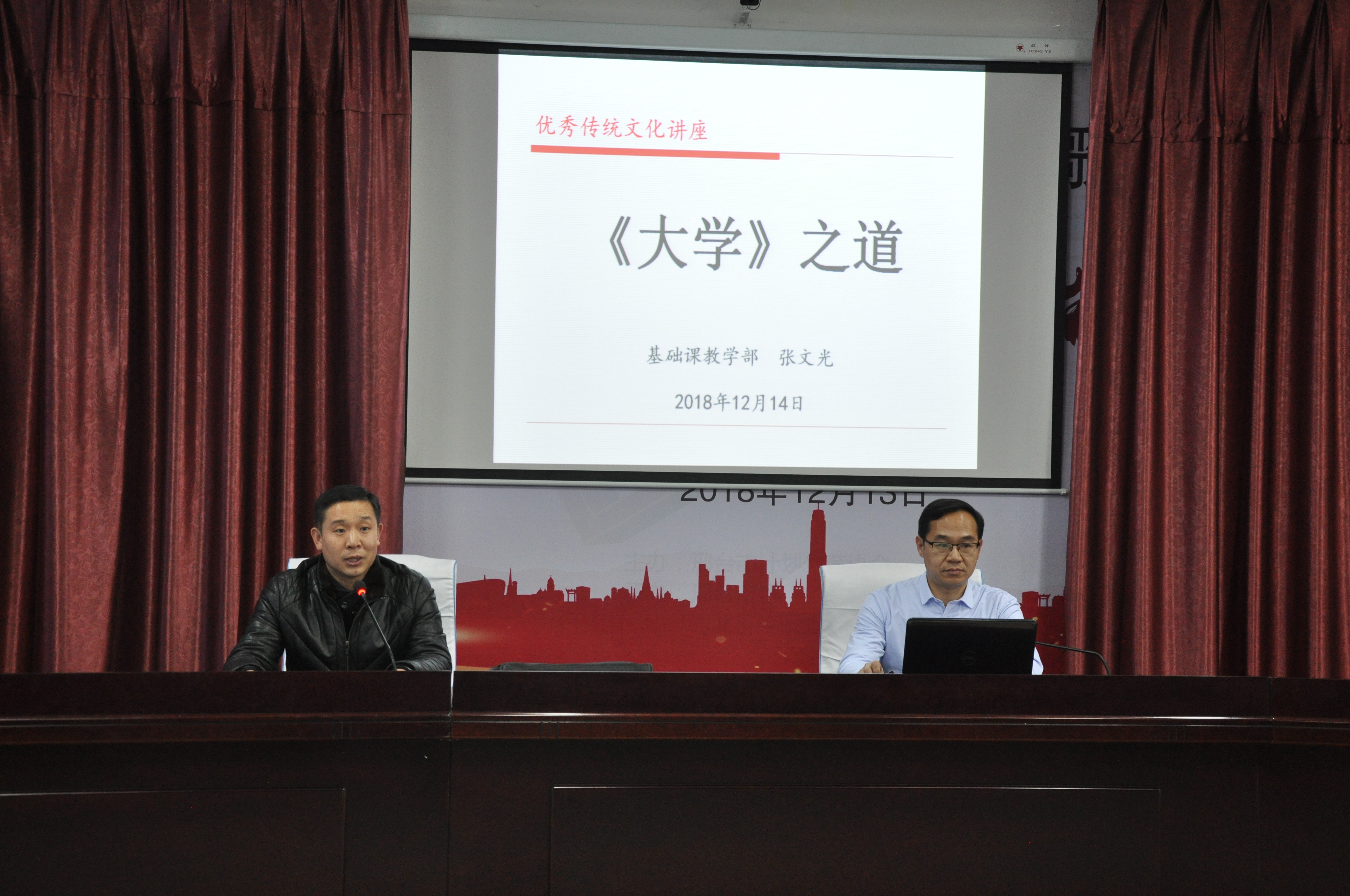 语文教研室主任张文光以《<大学>之道》为题,为大家解读了儒家“修身、齐家、治国、平天下”的人生追求。张文光介绍了“四书五经”的历史传承,从整体上概述了《大学》的历史地位;详细地解读了《大学》中的“三纲”“六证”“八目”;针对职业院校道德教育,阐述了《大学》的现实意义,启发学生结合自己的生活学习继续思考《大学》之道的真谛。