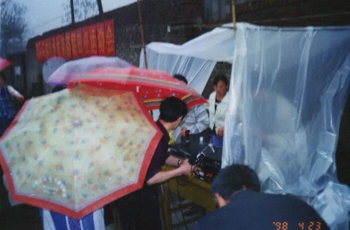 1998年4月,第25届田径运动会,工作人员在风雨中保护播音和录像设备。