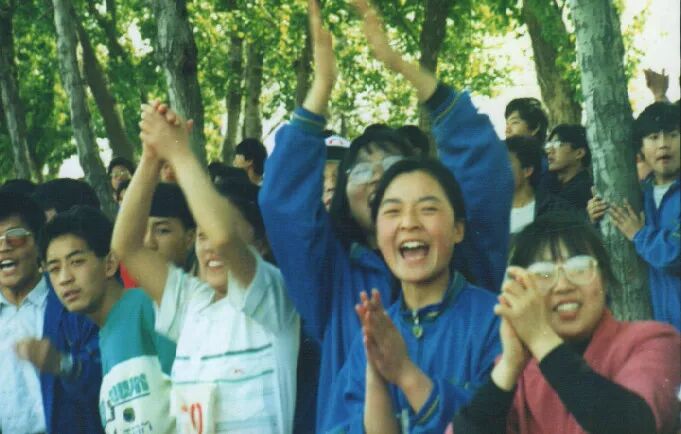 1992年4月,第19届田径运动会同学们为运动员加油。