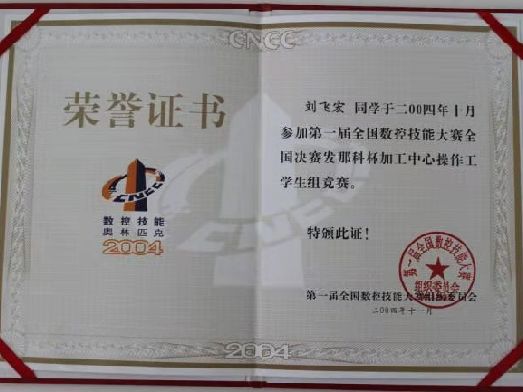 欧宝官方体育app下载ios 学生刘飞宏参加第一届全国数控技能大赛全国决赛发那科杯加工中心操作工学生组竞赛,取得第51名(2004年)