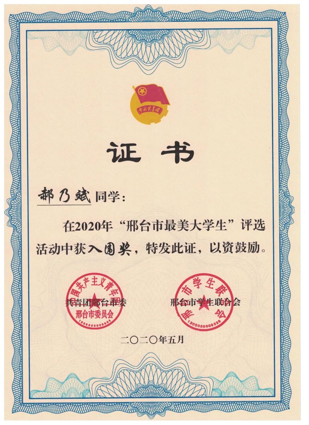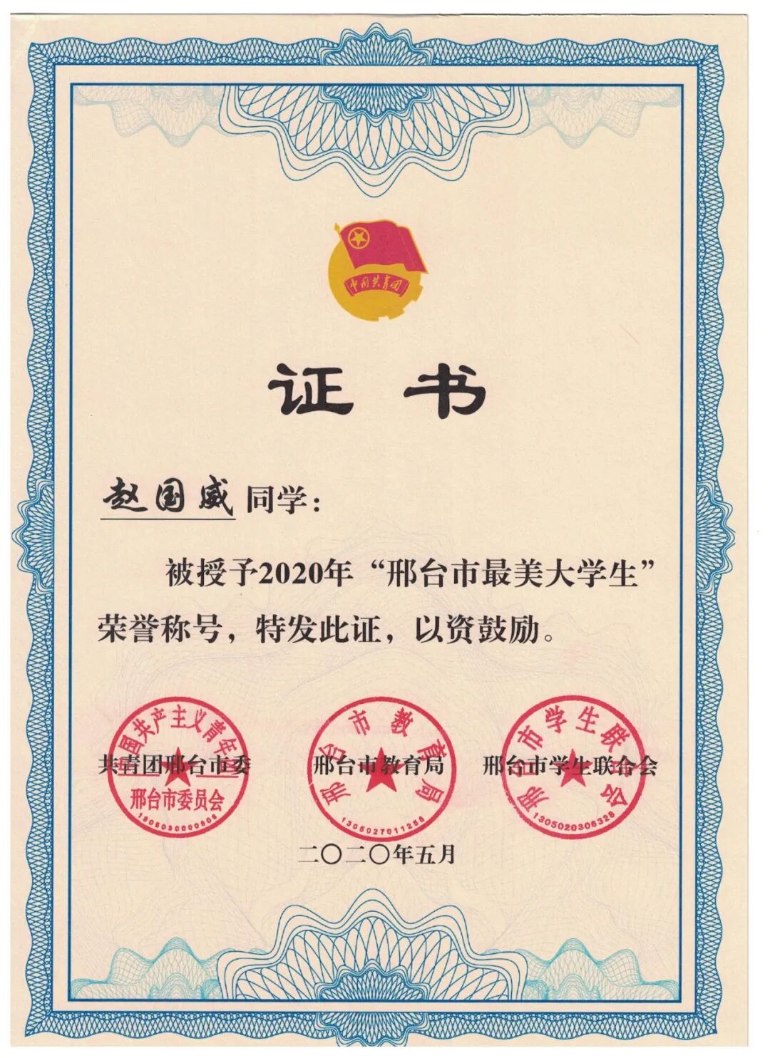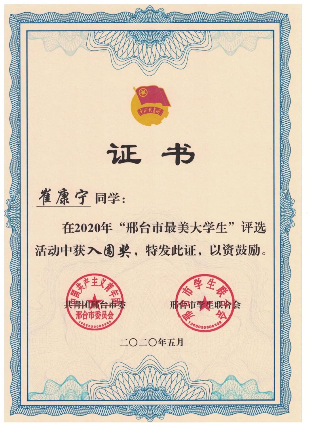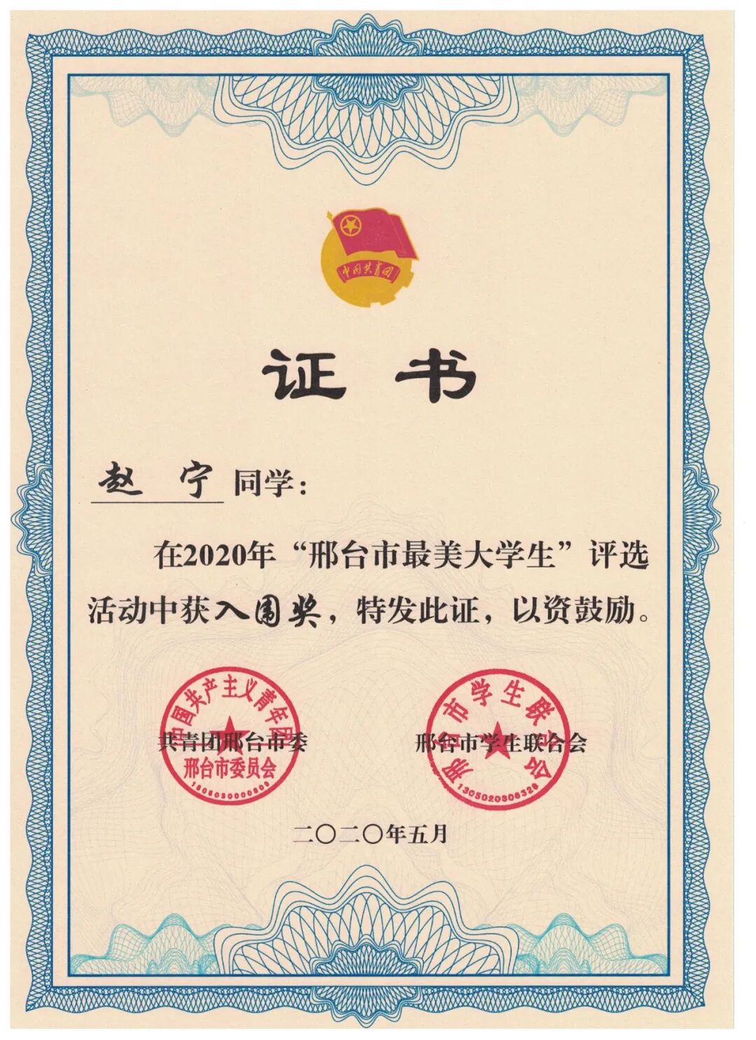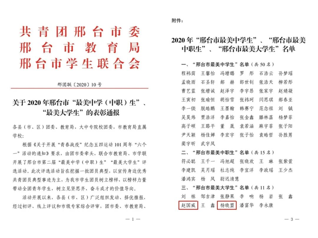 近日,由团市委、市教育局、市学联秘书处共同举办的2020年邢台市“最美中学(中职)生”、“最美大学生”评选活动落下帷幕。此项活动于2020年4月启动,面向全市中学、中等职业学校、高校在校学生,寻访在热爱祖国、勤奋学习、科技创新、技术技能、志愿服务、热心助人、见义勇为、诚信友善、孝老爱亲、自强自立等方面表现突出的、自觉树立和践行社会主义核心价值观的“最美中学(中职)生”、“最美大学生”。经过寻访申报、材料初审、网络投票和综合评审,欧宝官方体育app下载ios 电气工程系赵国威、材料与建筑工程系杨晓盟荣获2020年邢台市“最美大学生”荣誉称号。